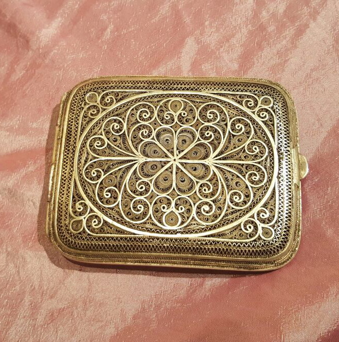 montură în alpaca, turnată, filigranată și argintată tabacheră de damă, minuțios decorată prin filigranare manuală accesoriu utilizabil și ca port-card / port-visit compoziție de motive floral-vegetale elaborate cu o remarcabilă densitate și finețe deschidere batantă prevăzuta cu șarnieră sistem de deschidere acționabil din buton interior prevăzut cu anouri utile atașării unor elastice de prindere a țigaretelor veche manufactură de […]
