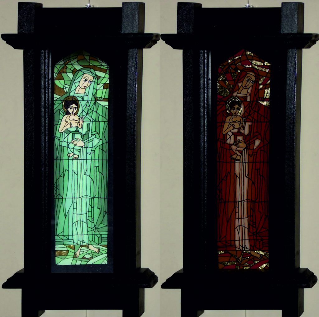 Icoana pe sticla cu foita de aur „Fecioara Maria cu Pruncul”. diverse reprezentari – cromatica diferita Dim.:50×22 cm