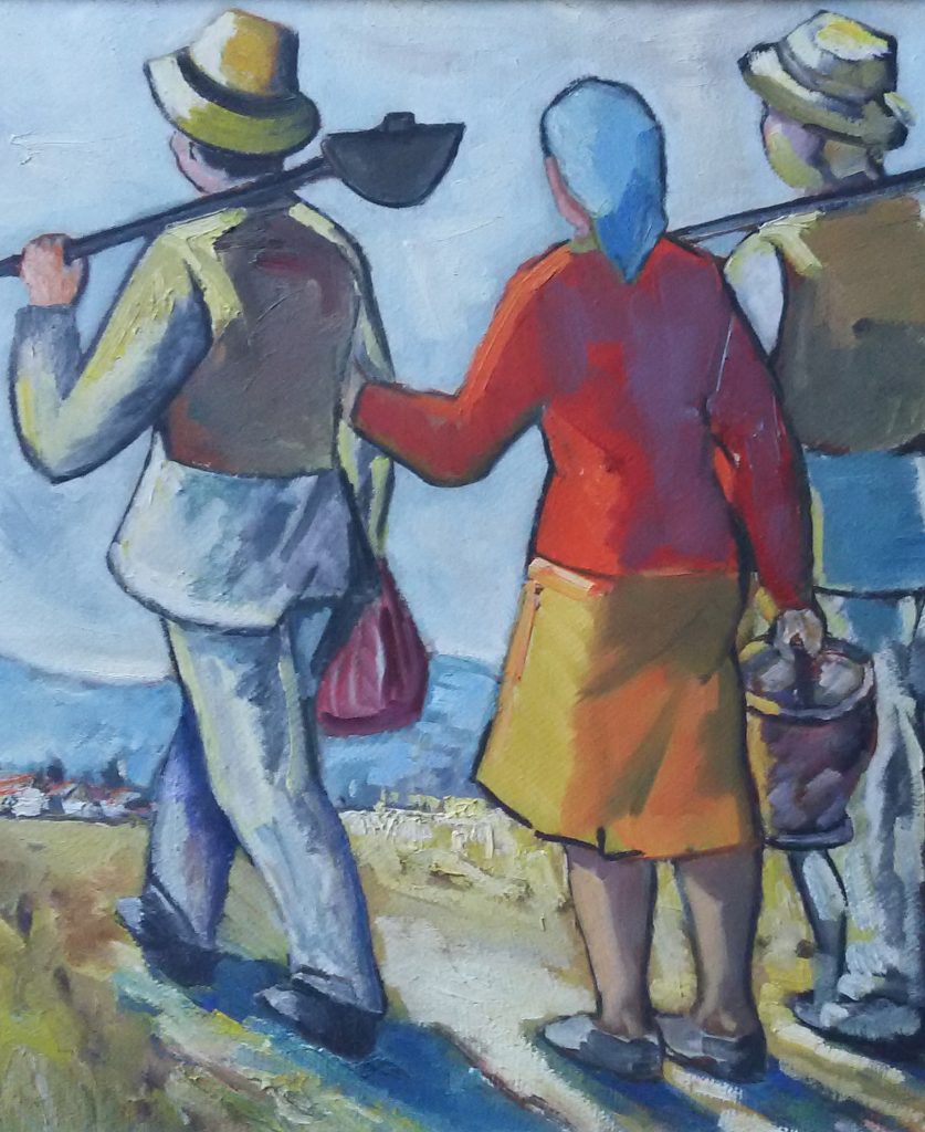 Autor: Luca Florea „Intoarcere de la munca agricola”. semnat dreapta jos Tehnica: ulei pe placaj Dimensiuni lucrare: 66x95cm Lucrarea este inramata