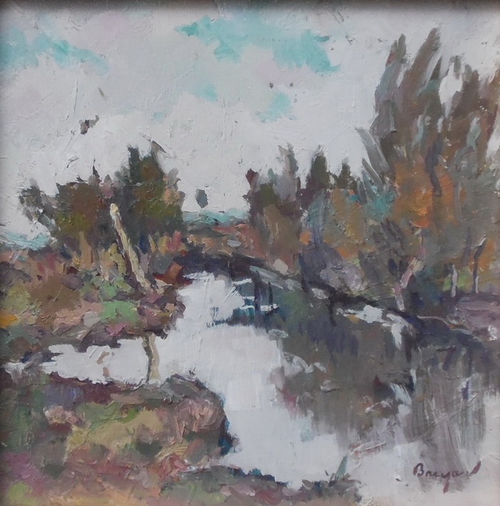 Read More Autor: Iacob BRUJAN(1898-1984) „Peisaj”. semnat stang jos Tehnica: ulei pe mucava Dimensiuni lucrare: 20×20 cm Lucrarea este inramata – rama originala